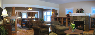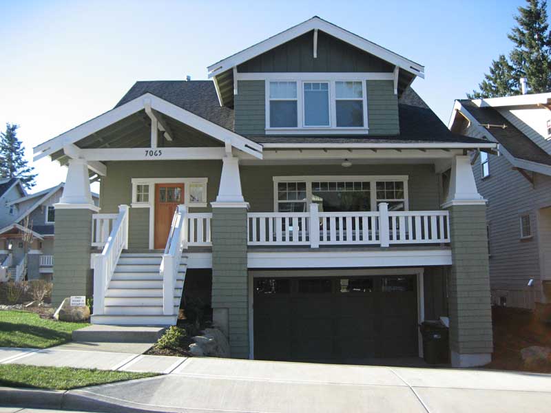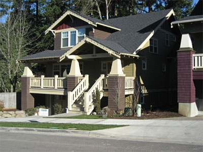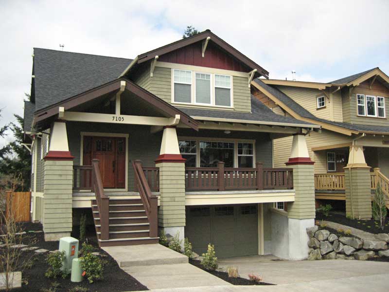 First built at Garden Grove Neighborhood, this particular house best expresses the bungalow type, with a largely roof dominated façade with a medium sized gable dormer and a open timber-framed gable roof to high-light the entry. For floor plans, please see this house in “Plans for Sale”.