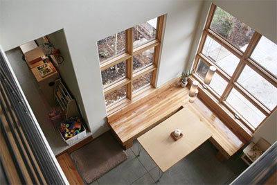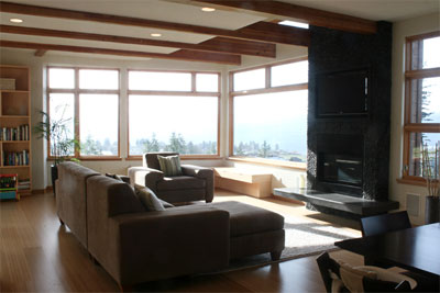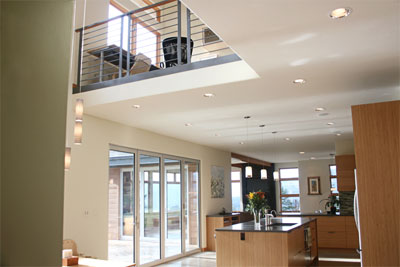 This house designed in a fairly contemporary manner is located 800' above the Columbia River takes advantages of the view, the solar passive gain and to minimize the gorge winds by with the geometry of the house.