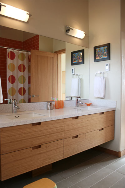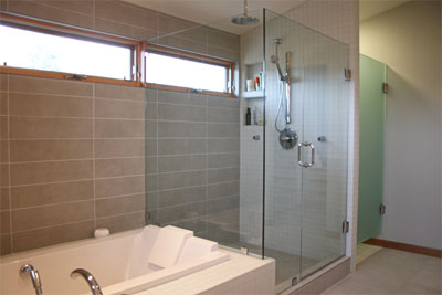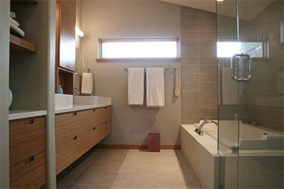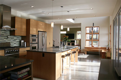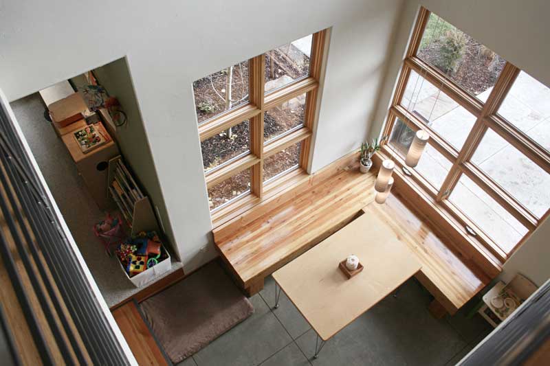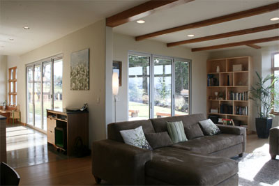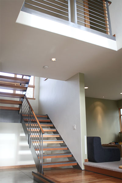 The floor plan consists of a core of utilities, laundry and garbage storage on the first floor and bathrooms on the second floor with the south and view facing rooms wrapping around it on 3 sides. Because the core is on the north side, the amount of north facing windows are minimized. The kitchen, being just south of this core comes the center of the house, separating the more public living room and dining rooms on the west side of the house where the front entry is, from the family room on the east. On the north side, through the core, is an entry to the garage / loft , a separate building just behind this house. Since the neighborhood CC&Rs mandates a minimum of 1, 600 sf first floor, the left over space not used by the bedrooms upstairs was designed to be a deck off of the master bedroom. So both this deck and the living room which it covers below it has sweeping and expansive views of the Columbia Gorge and Mt. Hood to the South west. The construction is due to be completed in mid-late 2007.