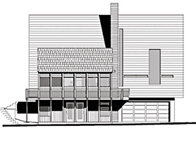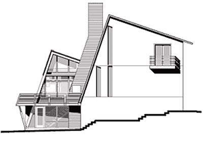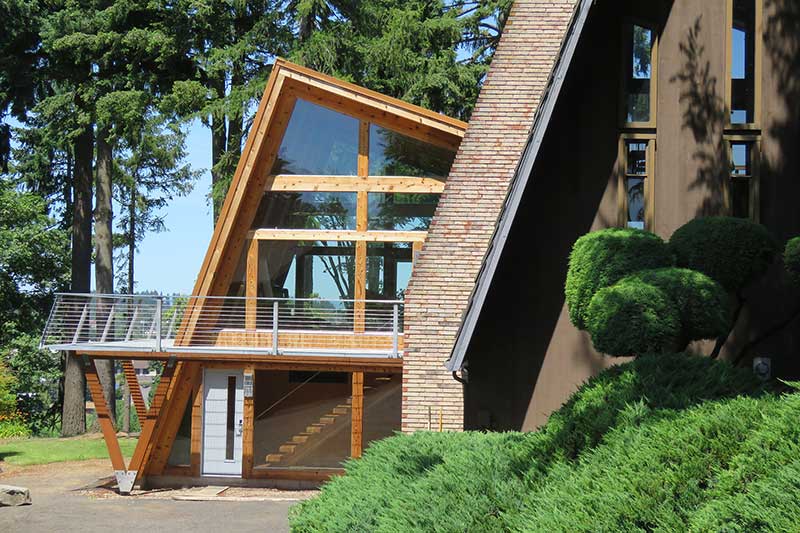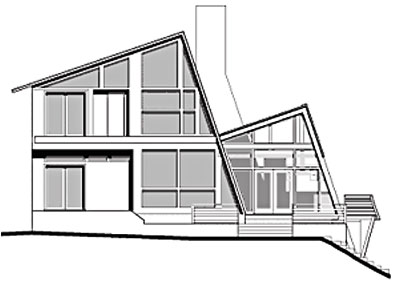 The new 2-story addition, comprising of a kitchen on the main floor and on the lower floor a guest room and a new front entry, serves as a beacon for the rest of the house. The existing front of the facade has few windows and presents a very uninviting look to the house. The new addition is designed to be well-lit and open with large expanses of glass to take advantage of the view of Mt. St. Helens to the north. The addition also has a wrap-around deck and south canopy to temper the effects of the strong summer sun. The angled geometry of the walls and the contrasting porch supports, matches the angles of the existing house.