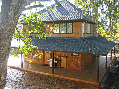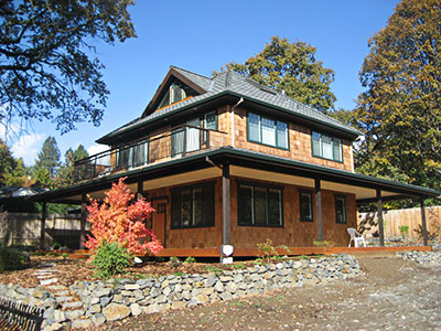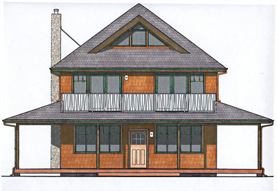 Currently under construction, this compact 1,540 sf 3-bedroom cottage was designed to be economical. The great room incorporates the living, dining and kitchen area. The stairs wraps around a library area on its way to the second story where it ends in a pentagon shaped hall way that provides entrances to all three bedrooms and bathroom. A wrap-around porch on all sides gives this house a outstanding presence in the neighborhood.