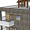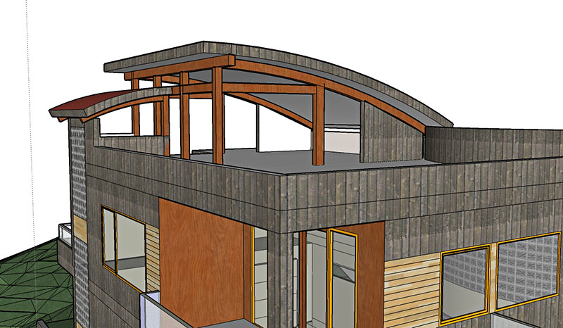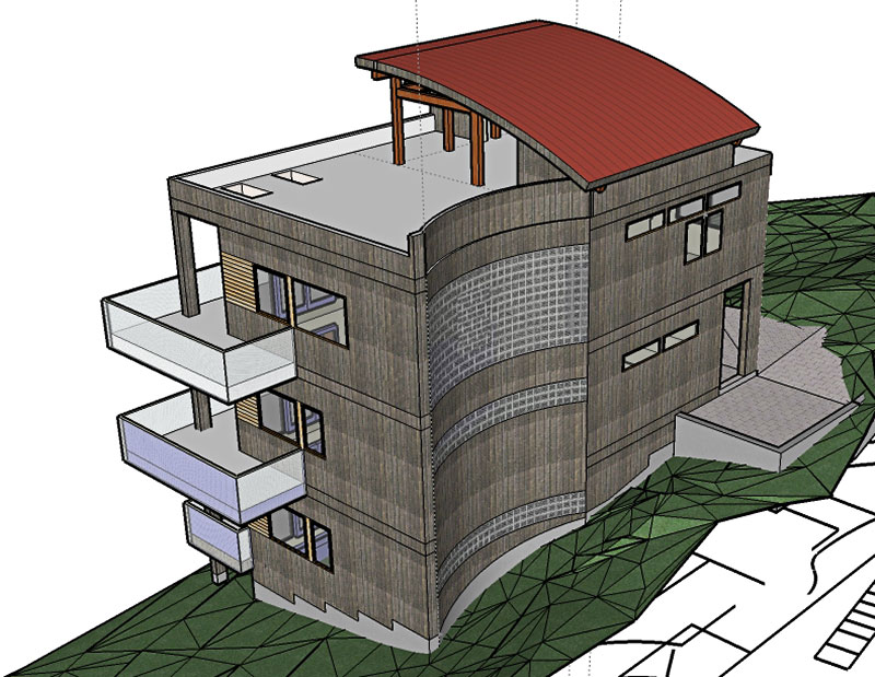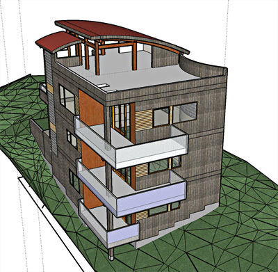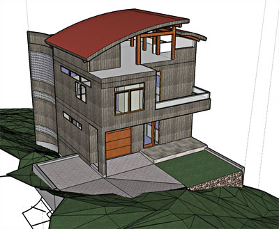 These model images shows an early version of this house, also under design development. Due to the the tight constraints on the site, the house is located as close as possible to the road in order for the neighbor's house to retaining views down the hillside. The footprint of the house follows the side yard setback limits. The curved glass block wall became an inspiration for the curved roofs at top of the house, partially as response to the the building height restrictions.